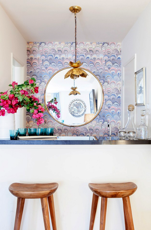 Have you ever seen a more gorgeous home bar?! We've just been working with a local client on a home bar, but it's very masculine with a "shaken not stirred" vibe. I love it, but I must say this beautiful wallpaper, gold mirror and turquoise glasses are pretty divine too.