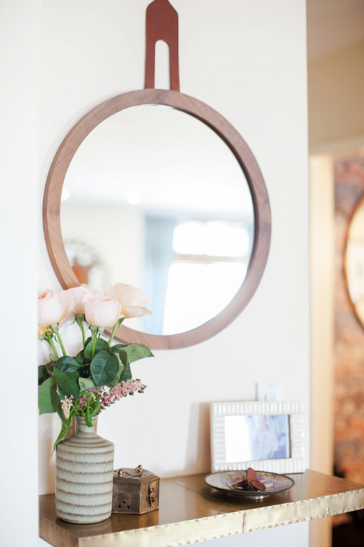 I love this entranceway. A simple floating shelf big enough for some flowers, a bowl for your keys, and a mirror is all you really need, and is perfect when space is tight. Many homes open up straight into a living room, but it's nice to create a sense of an entrance, even if it's small.